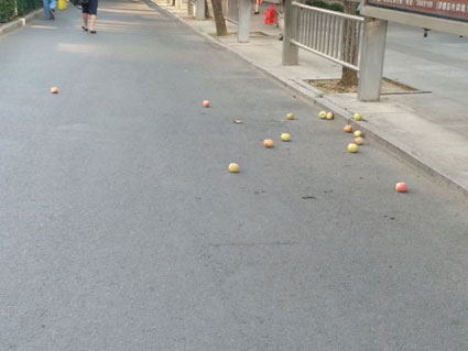 14日早上7點左右,在人民南路市體育中心西門北側的非機動車道上散落一地蘋果,并有一些人撿拾帶走。經過市民看到后,不知道怎么回事,還以為是別人掉下的被撿走了。記者詢問得知,是賣蘋果的自己扔到地上的,經過市民覺得很可惜,便撿拾一些比較好的蘋果帶走。在附近一名賣梨子的商販介紹,賣蘋果的覺得剩下一點蘋果不好處理,就直接扔掉走了。