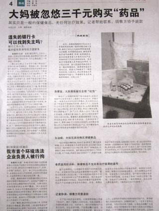 買(mǎi)藥碰上大忽悠。騙子花樣百出,一不留神就可能上當(dāng)受騙。為此,早報(bào)熱線(xiàn)也多次對(duì)一些騙術(shù)進(jìn)行了揭露,不過(guò)還是有一些人被騙。今年6月份,就有一位市民反映,“我母親最近被人忽悠,購(gòu)買(mǎi)了好幾千元的各種保健床墊,和所謂對(duì)高血壓、糖尿病等很多老年病都有‘療效’的保健食品!睋(jù)了解,一些不良商家,為了推銷(xiāo)保健產(chǎn)品,夸大保健產(chǎn)品功效,忽悠老人購(gòu)買(mǎi)。經(jīng)過(guò)記者幫助聯(lián)系,銷(xiāo)售方給予退款。早報(bào)熱線(xiàn)以《大媽被忽悠三千元購(gòu)買(mǎi)“藥品”》為題進(jìn)行了報(bào)道,以此提醒市民,特別是老年人時(shí)刻警惕,以免上當(dāng)受騙。
