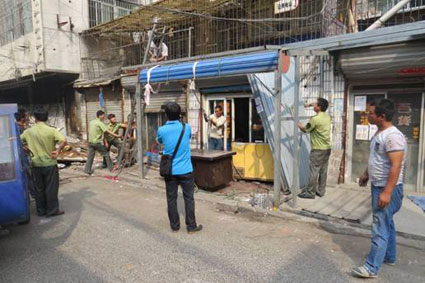 圖為執(zhí)法人員對(duì)巷內(nèi)私搭亂建進(jìn)行拆除。
