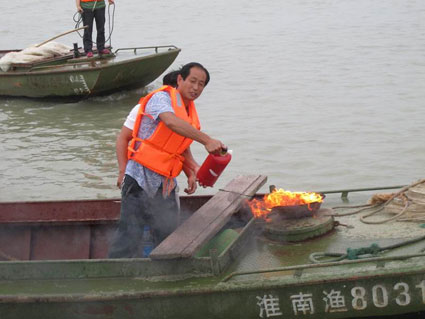 淮南市農委接報后,立即對險情進行等級評估,指揮人員到位,根據險情,宣布進入Ⅳ級響應,并立即指令淮南市漁政處協調海事等部門進行搜救。演練場景中,現場指揮船只、人員陸續(xù)到達事發(fā)水域,漁政船靠近事故船舶,發(fā)現落水人員并救起,漁政人員組織幫助起火漁船滅火,滅火后拖帶漁船靠岸。隨后參加漁業(yè)船舶水上搜救的船舶集結返港,演練結束。