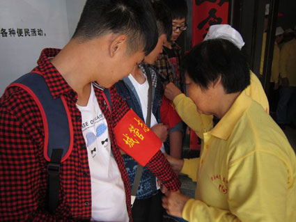 圖:老城管志愿者為大學(xué)生戴上紅袖章。