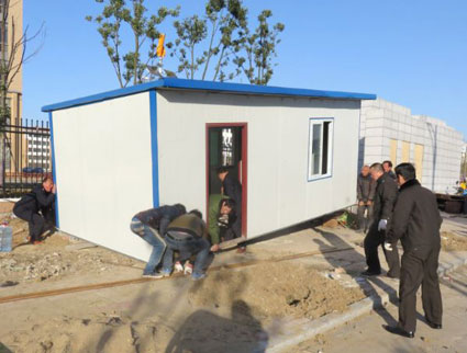 圖:在城管執(zhí)法人員的勸說下,一些商販將彩板房移除。