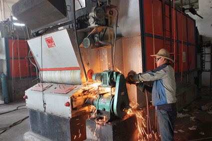 圖三:盛紹貴對改用了天然氣的蒸汽鍋爐設(shè)備進行檢查。(圖一圖二由市環(huán)保局提供)
