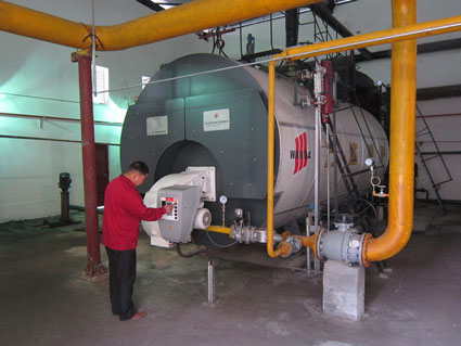 記者來到鍋爐房看到,鍋爐房的大門被油漆噴刷一新,走進鍋爐房內(nèi),里面兩臺體積龐大的蒸汽鍋爐映入眼前,水泥地面整潔干凈。記者看到,鍋爐房里一共有3臺蒸汽鍋爐,其中2臺正在運轉(zhuǎn)工作,1臺蒸汽鍋爐留作備用,負責(zé)鍋爐房的工作人員盛紹貴師傅正在忙著檢查鍋爐運轉(zhuǎn)情況!安挥脽毫,改用了天然氣。你看,去年你們來的時候,這里還都是黑乎乎的,到處都是煤灰,現(xiàn)在鍋爐房改造了,里里外外干干凈凈的了,整個煥然一新。”盛紹貴笑著說,“現(xiàn)在最直接的感受就是工作輕松了,環(huán)境變好了。”