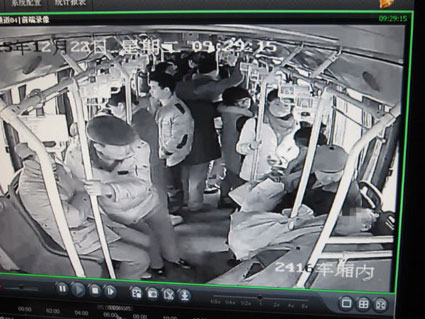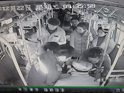 楊金豹介紹,這位老人從泉山上車,上車后就坐在了他后面的座位上,到老龍眼公交站,在乘客上車的時(shí)候,發(fā)現(xiàn)老人不正常,整個(gè)身體傾斜將要從座位上滑落到地上。記者通過公交車上的監(jiān)控錄像看到,22日上午9時(shí)28分許,老人已經(jīng)感覺不適,背靠在座椅上,臉上出現(xiàn)難受的表情,引起旁邊乘客的注意。9時(shí)29分,一位從老龍眼車站上車的男乘客上車看到老人的情形后,便告訴了駕駛員楊金豹。楊金豹介紹,當(dāng)時(shí)公交車就停靠在老龍眼車站,供乘客上下車,就在這時(shí),一名40歲左右的男乘客上車看到了老人癱倒在座位上。