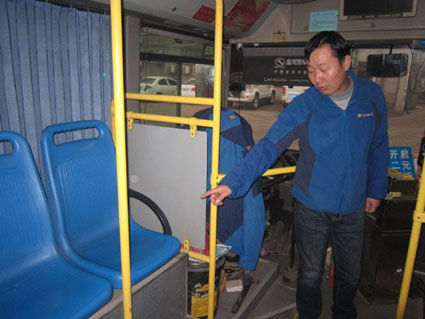 圖一:公交車駕駛員楊金豹指著老人當(dāng)時(shí)所坐的位置介紹情況。