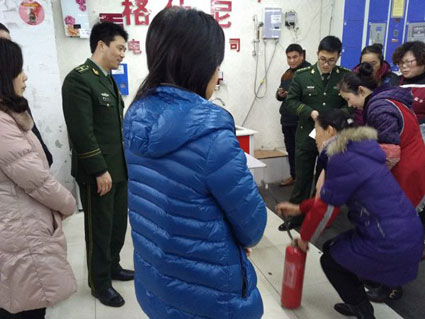 圖為:工作人員正在檢查藍(lán)天聯(lián)華超市員工會(huì)不會(huì)正確使用滅火器。