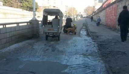 圖為結(jié)冰路面,行人騎車經(jīng)過(guò)都十分小心。