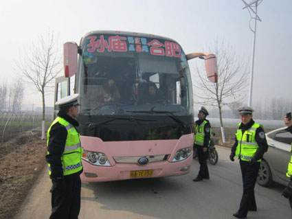 圖三:執(zhí)法人員對(duì)合肥至孫廟客運(yùn)班線車輛進(jìn)行查處。