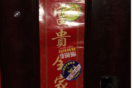 許先生帶著淮河早報、淮南網記者從居民樓的底層往上走,幾乎每一家的春聯(lián)都未能幸免,被貼上了各式各樣的宣傳紙張,有的門把手上還有廣告水印。許先生表示,樓道里的小廣告從來就沒有停過,可這回小廣告居然貼到了大門的對聯(lián)和“!弊稚,看著讓人心煩。“有的小廣告貼到門上,也容易去掉?少N到春聯(lián)上的就不容易清除。有的小廣告粘的不干膠,揭下來也有痕跡。還有的是即時貼,粘上去就別想摳下來。”許先生無奈地說,“貼小廣告的真是越來越猖狂,在樓道里貼廣告不說,還貼在了對聯(lián)上,太過分!!