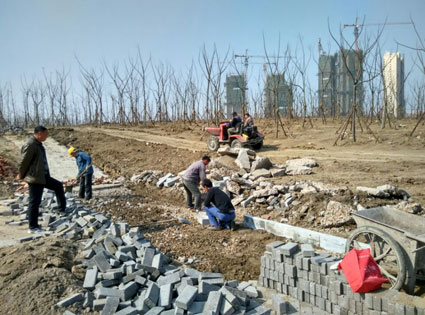在公園東側(cè)的主入口處,一道上百米的圍墻將公園內(nèi)外隔成了兩個世界,墻外車水馬龍、人來人往,墻內(nèi)則是一片繁忙的施工景象。在主入口處正在進行的是地磚的鋪設工作,工人們有的從路邊卡車上卸下水泥,有的搬運方磚,有的仔細鋪設,這里將要完成的是一處呈“T”字形的健身休閑廣場,目前地磚已鋪設大半。