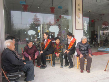 圖為兩名愛心服務(wù)隊的志愿者與老人們拉家常。