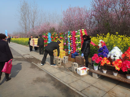 圖:城管執(zhí)法人員正在現(xiàn)場(chǎng)引導(dǎo)祭祀品攤點(diǎn)擺放