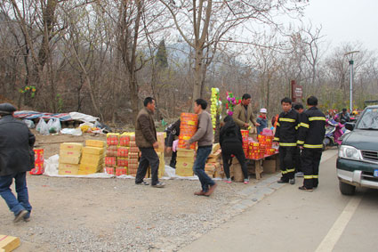 圖二:舜耕山風(fēng)景區(qū)管理處森林消防人員在勸導(dǎo)消防通道上占道經(jīng)營(yíng)的商販