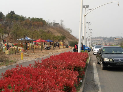 3月26日、27日,淮河早報、淮南網(wǎng)記者在洞山西路、東西部二通道、丁山路等路段看到,只要是通往墓地路口,就有大批售賣紙錢、鞭炮、絹花等祭祀物品的攤位。這些攤位都是臨時出來擺放的,有的支起了桌子,上面堆放著一摞摞紙錢和金銀元寶等;有的索性將攤位擺在地上。記者發(fā)現(xiàn),這些攤位不是擺放在路口,就是占據(jù)著進出墓區(qū)的通道,不僅有礙市容市貌,而且影響道路的暢通。