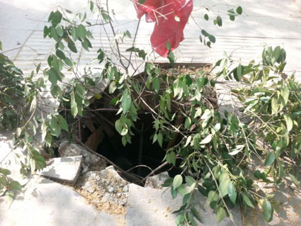 圖:人行道上塌陷的窨井口被放入樹(shù)枝以提醒行人