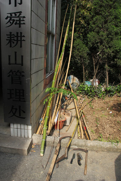 圖:僅13日一天風(fēng)景區(qū)管理處就收繳了用來(lái)采摘槐花的鐵鉤、鐮刀等工具30多個(gè)。