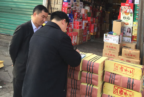 圖:街道執(zhí)法人員正在檢查煙花爆竹經(jīng)營(yíng)點(diǎn)