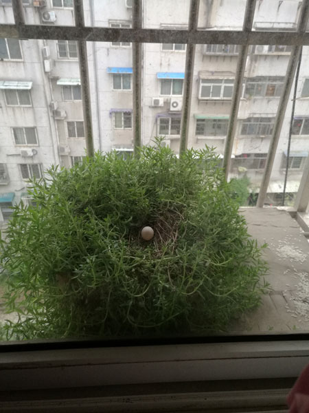 圖一:4月2日拍攝下的大鳥在窗臺上的花盆內(nèi)下了一個鳥蛋