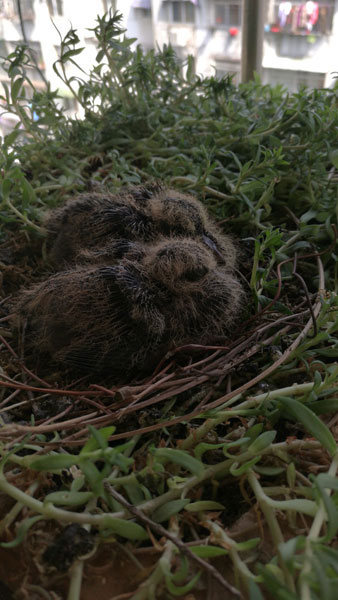 馬先生躲在玻璃門后面,每天觀察大鳥并用相機記錄著大鳥的生活,他看見一只大鳥在窩內(nèi)孵化,另一只大鳥就停在對面一幢樓房的陽臺上,密切關(guān)注著這邊的一舉一動,像是放哨執(zhí)勤的衛(wèi)兵。經(jīng)過近20天的孵化,4月22日,兩只鳥蛋孵化出了小鳥,每天大鳥嘴里銜著蟲子,窩里的小鳥張大嘴巴伸長了脖子,嘰嘰喳喳地等待喂食。