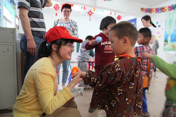 志愿者們的到來受到了小朋友的熱情歡迎,志愿者們陪孩子們聊天、做游戲,送給他們牛奶、零食,給予孩子們物質(zhì)及精神上的安慰。