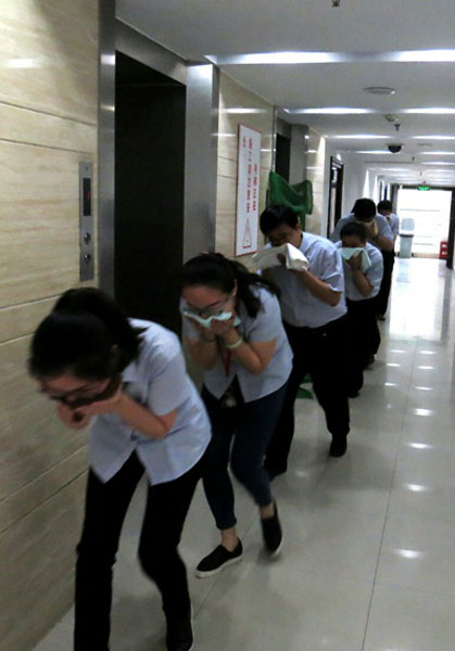大樓消防警鈴響起,各樓層消防廣播循環(huán)播出火警疏散指令,滾滾濃煙從7層走廊西端蔓延開來。樓內全體人員在各樓層疏散引導員的引導下,手持濕毛巾捂住口鼻低頭彎腰從東側樓梯有序向樓下撤離。救護組隊員接到命令后沖上大樓6層用擔架將一“受傷”女員工護送到安全地帶。