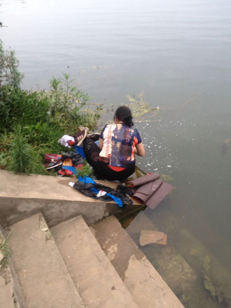 圖為一名婦女在老龍眼濕地公園內(nèi)刷鞋洗衣。