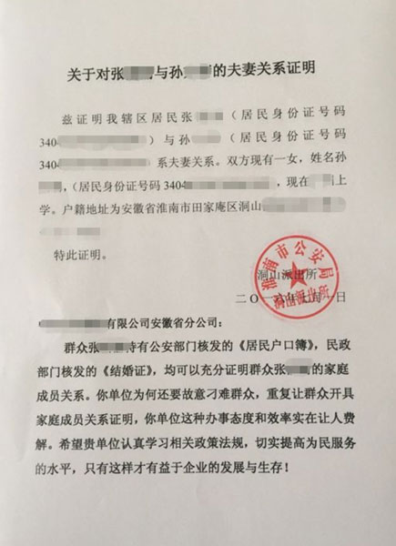7月4日,淮河早報(bào)、淮南網(wǎng)記者看到了這份夫妻關(guān)系證明,上面寫著“茲證明我轄區(qū)居民張某某與孫某某系夫妻關(guān)系……”內(nèi)容還包括兩人的子女上學(xué)情況以及居住地。負(fù)責(zé)辦理證明的民警吳晨琰表示,張女士憑借身份證、戶口本和結(jié)婚證完全可以清楚明白地證明兩人的夫妻關(guān)系,為什么保險(xiǎn)公司要多此一舉,給居民辦事增添麻煩?他又表示,考慮到張女士的家庭情況,為了她能夠順利拿到這筆保險(xiǎn)返還金,加上張女士手續(xù)齊全,關(guān)系合理,洞山派出所出于人道主義和便民利民的原則,還是幫助她開具了證明。