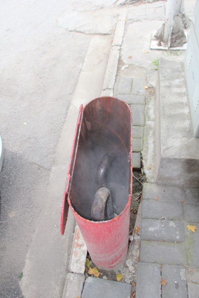 接報后,淮河早報、淮南網(wǎng)記者于7月11日上午來到水廠路。剛進入水廠路,就看到人行道邊有一個紅色的鐵箱子,而且還有編號;春釉鐖、淮南網(wǎng)記者下車仔細觀察,該紅色箱子使用鋼板焊制,用手觸摸感覺很燙,溫度應該有60℃左右,打開箱子沒有上鎖的箱蓋,可看見箱子內(nèi)部有兩根頂部彎曲的彎管,正對外冒出帶有異味的蒸汽;春釉鐖蟆⒒茨暇W(wǎng)記者沿路數(shù)了一下發(fā)現(xiàn),這樣的紅箱子一共有12個,每一個都有編號。對于這些紅色箱子的用處,淮河早報、淮南網(wǎng)記者也是一頭霧水。