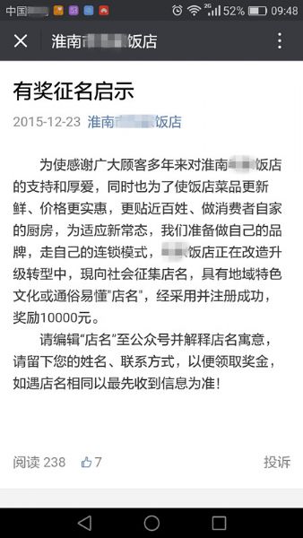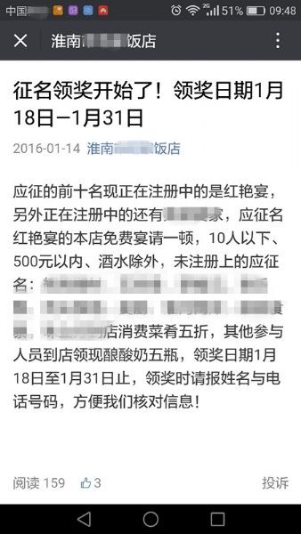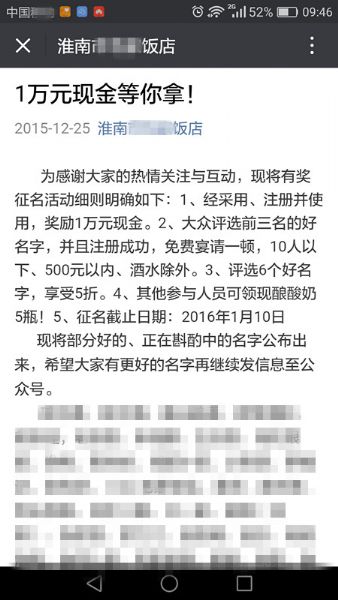 淮河早報(bào)、淮南網(wǎng)記者根據(jù)鄔先生的報(bào)料,查詢了該酒店的微信公眾號(hào)。在該酒店的微信公眾號(hào)里,淮河早報(bào)、淮南網(wǎng)看到,該酒店發(fā)了兩次有獎(jiǎng)?wù)髅麊⑹,第一次?015年12月23日發(fā)的,內(nèi)容是“飯店正在改造升級(jí)轉(zhuǎn)型中,現(xiàn)向社會(huì)征集店名,具有地域特色文化或通俗易懂‘店名’,經(jīng)采用并注冊(cè)成功,獎(jiǎng)勵(lì)10000元!钡诙问2015年12月25日,內(nèi)容是“為感謝大家的熱情關(guān)注與互動(dòng),現(xiàn)將有獎(jiǎng)?wù)髅顒?dòng)細(xì)則明確如下:1、經(jīng)采用、注冊(cè)并使用,獎(jiǎng)勵(lì)1萬(wàn)元現(xiàn)金。2、大眾評(píng)選前三名的好名字,并且注冊(cè)成功,免費(fèi)宴請(qǐng)一頓,10人以下、500元以內(nèi)、酒水除外。3、評(píng)選6個(gè)好名字,享受5折。4、其他參與人員可領(lǐng)現(xiàn)釀酸奶5瓶!5、征名截止日期:2016年1月10日!辈ⅰ安糠趾玫摹⒄谡遄弥械拿止汲鰜(lái)”。