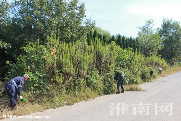 圖:舜耕山風景區(qū)管理處工作人員正在清除沿山路邊的“一枝黃花”