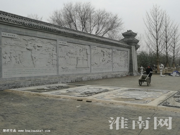 1月10日上午,淮河早報(bào)、淮南網(wǎng)記者來到了正在建設(shè)當(dāng)中的舜文化廣場(chǎng)。沿著美麗的環(huán)山路一路東行,在青山綠水的環(huán)抱中,一座灰色的仿古浮雕墻隱約其中。走近一看,整座浮雕墻位于一處正在平整的廣場(chǎng)之中,巨大的墻體上刻畫著有關(guān)舜的故事;廣場(chǎng)用灰色的方磚鋪就,地面上也裝飾著浮雕畫,四周還裝點(diǎn)了白色的仿古建筑。