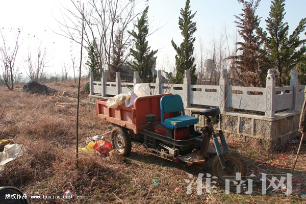 在現(xiàn)場(chǎng),淮河早報(bào)、淮南網(wǎng)記者看到,在兩座豪華墓葬的北側(cè),也有墓葬使用青石矮墻圍擋而墳?zāi)骨耙呀?jīng)被新鋪了一層水泥臺(tái)子,而水泥尚未干透。而墓葬的西側(cè),有三座墳塋,這三座墳塋的土色十分新鮮。在豪華墓葬南面也有新墳,并且墳的周圍使用紅磚和水泥圍了起來(lái)。旁邊的空地上則堆放著一堆紅磚,根據(jù)紅磚的色澤來(lái)看,應(yīng)該是剛運(yùn)到不久,在紅磚的旁邊還擺放著三個(gè)并未刻字的新墓碑。在墓葬東側(cè),淮河早報(bào)、淮南網(wǎng)記者發(fā)現(xiàn)被修墳者隱藏起來(lái)的施工用的架車和用來(lái)運(yùn)輸建材的機(jī)動(dòng)三輪車,還有裝水的大塑料桶和鐵鍬等施工工具,雖然在現(xiàn)場(chǎng)并未發(fā)現(xiàn)修墳人員,但是根據(jù)現(xiàn)場(chǎng)遺留的物品來(lái)看,就像一個(gè)正在施工的工地。