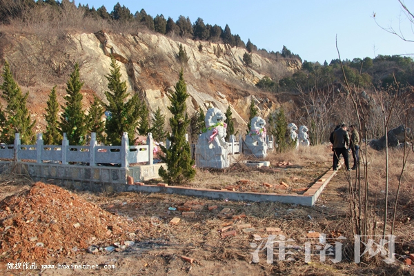 在這個(gè)剛被修復(fù)的廢棄石頭塘內(nèi),淮河早報(bào)、淮南網(wǎng)記者看到多處墓葬,其中幾座墳塋的土還都十分新鮮,看樣子像是剛埋不久的墳?zāi)。而最引人注目的就是中心位置的兩個(gè)大型墳?zāi)梗瑑勺鶋災(zāi)箹|西排列,采用青石矮墻圍成,青石墻體上面裝有雕花的石質(zhì)欄桿圍護(hù),石欄內(nèi)種了一圈松樹,而僅作為鎮(zhèn)墓的四只石獅子就有兩米高,石獅子南面用紅磚圍了起來(lái),像是還要繼續(xù)修建平臺(tái)之類的建筑;春釉鐖(bào)、淮南網(wǎng)記者發(fā)現(xiàn),西面的墳?zāi)乖趪鷻趦?nèi)有墳塋,墳前還有盛放各種祭品碟子以及水果和其它貢品。而東面的墳?zāi)箘t是平地,并無(wú)墳塋。
