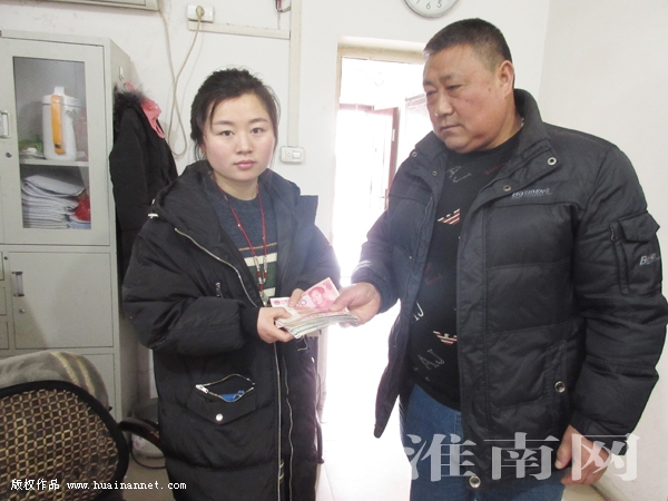 圖:樊女士從客運(yùn)四車隊(duì)隊(duì)長(zhǎng)施培喜手中接過(guò)失而復(fù)得的現(xiàn)金。