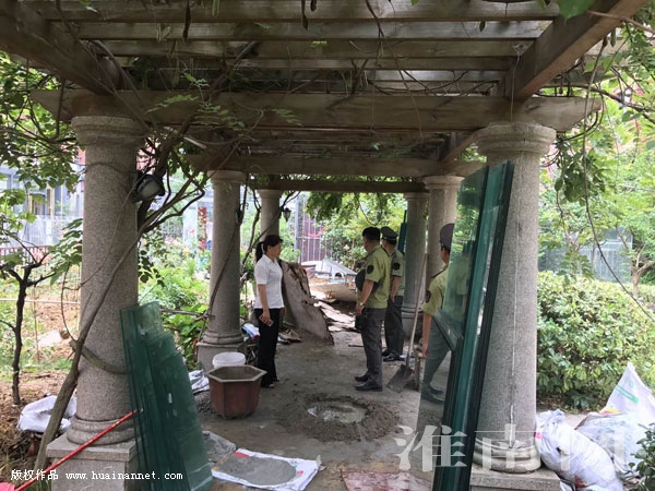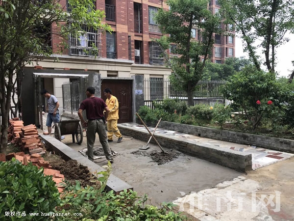 隨后淮河早報、淮南網(wǎng)記者電話聯(lián)系山南新區(qū)城管行政執(zhí)法局。沒多久,城管執(zhí)法人員就趕到山南印象小區(qū)。淮河早報、淮南網(wǎng)記者隨同城管執(zhí)法人員一起進入小區(qū)內(nèi)巡查,此刻,44號樓綠化帶內(nèi)修路工程已經(jīng)完工,施工人員也已經(jīng)離開。46號樓一戶居民正在公共綠地內(nèi)施工,執(zhí)法人員上前查看之后通知其立即停工,但是效果不明顯。