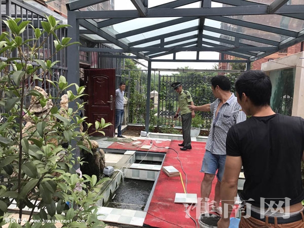 該小區(qū)46號樓,一戶居民把小區(qū)大面積綠地使用圍欄圍擋起來,加蓋了玻璃屋頂,并在原本的公共綠地上修建成為室內(nèi)魚池。在該住戶西側(cè)的一個綠廊內(nèi),堆放著大量玻璃和建材,地上擺放著氧氣瓶、切割機等施工設(shè)備,幾個工人正在忙著,看樣子是打算進一步在小區(qū)綠地內(nèi)進行擴建。