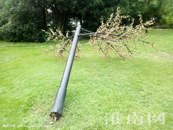 19日下午2時許,淮河早報、淮南網(wǎng)記者途經(jīng)市園林管理局門口時,發(fā)現(xiàn)其門口的游園里有一棵景觀樹橫躺在草地上,景觀樹的根部已斷裂,裸露出里面包裹的東西。據(jù)前來游玩的市民介紹,這棵景觀樹倒地大約是因為上午的一場大暴雨,他們看著也很可惜,希望有關(guān)部門能盡快恢復(fù)。“這些景觀樹在夜間五彩斑斕,是淮南一道亮麗的風(fēng)景線,這樣躺在地上,不僅有礙觀瞻,而且也很浪費(fèi)!笔忻裾f道。