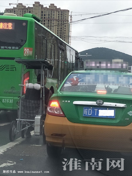 日前,一位市民打來淮河早報、淮南網(wǎng)熱線,稱他開車途經(jīng)淮舜南路和舜耕中路交叉路口等信號燈時,看到了一個殘疾人在車流中乞討(如圖)。