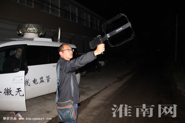 10月17日下午8時(shí),淮河早報(bào)、淮南網(wǎng)記者跟隨由大通公安分局刑警大隊(duì)、淮南市文化市場綜合執(zhí)法大隊(duì)和淮南市無線電管理處三家單位組成的執(zhí)法隊(duì)伍夜查“黑電臺(tái)”;茨蠠o線電管理所出動(dòng)無線電檢測車輛,利用車載儀器對“黑電臺(tái)”進(jìn)行追蹤定位,在儀器的指引下,執(zhí)法人員駕車,經(jīng)過一個(gè)多小時(shí)的奔波,最終把“黑電臺(tái)”的位置定位在我市大通區(qū)東部與定遠(yuǎn)縣交界處的一公里范圍內(nèi)。由于車載儀器無法查找出準(zhǔn)確的信號(hào)發(fā)射地點(diǎn),無線電管理處的技術(shù)人員只能使用手持檢測設(shè)備,步行對一公里范圍搜索,最終確定信號(hào)發(fā)射地點(diǎn)在聯(lián)通信號(hào)發(fā)射塔頂端。