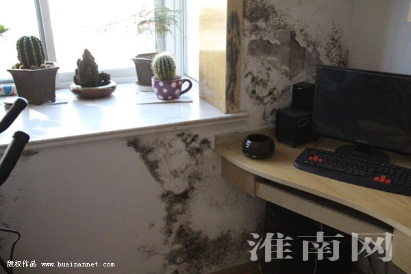 “剛開始維修正好在夏天,雨下得大又頻繁,而施工方在外墻皮被鏟去后就一直沒有做后續(xù)處理,導致我們很多居民家中滲水、漏水嚴重,我家不僅整面墻都長霉了,而且木地板也被雨水泡損了!”在采訪中,一位五樓的居民把淮河早報、淮南網(wǎng)記者喊到他家中,看看他家因漏水而造成的損失。在他北面的書房,淮河早報、淮南網(wǎng)記者看到靠近窗戶的白色墻面和窗套確實長滿了黑色的霉斑,墻皮出現(xiàn)了脫落,看著很不舒服;木地板也有起包的現(xiàn)象。在南面臥室的墻壁上,也出現(xiàn)了大面積的黑色霉斑。這位居民告訴淮河早報、淮南網(wǎng)記者,他們這棟樓一共6層4個單元,大約有幾十戶居民,因為他家不是頂樓,原先滲水并不嚴重,可后來外墻皮被鏟,又一直無人來施工,導致家中漏水非常嚴重!耙坏较掠晡揖蛽,整天呆在屋內(nèi),不時地去擦木地板上冒出來的水,就這樣挨過了幾個月。”這位居民說道。