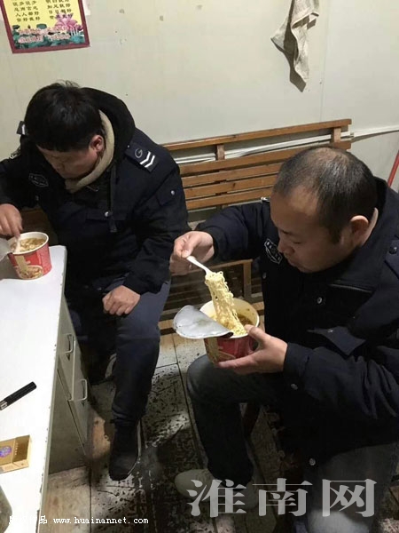 圖二:熊順興(左)和段兆昌吃著車隊送來的方便面充饑。(圖片由淮南市公共交通有限責(zé)任公司提供)