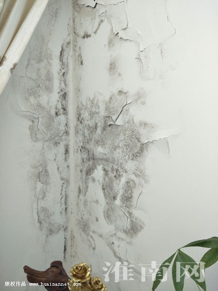 2408室的業(yè)主說他家的情況最嚴重,淮河早報、淮南網(wǎng)記者跟著該業(yè)主來到2408室,一進屋就看到客廳的墻上有黑黑的霉印,而且他家的廚房、衛(wèi)生間、臥室、陽臺都出現(xiàn)了不同程度的滲水。該業(yè)主表示淮河早報、淮南網(wǎng)記者看到的霉印還不算最厲害的,因為他家每年都會把以前的墻坯鏟除,再粉刷一次墻,所以這是最新的霉印;春釉鐖蟆⒒茨暇W(wǎng)記者看到該業(yè)主家臥室的頂上有凸出的像釘子一樣的東西。業(yè)主仿佛看出疑惑,立刻解釋到,這是他自己找的人來幫忙做的。因為屋頂漏水,屋里都得打傘,他找了物業(yè)、開發(fā)商卻解決不了問題,所以只有自己找專業(yè)人士在屋頂做了防護措施!半m然不好看,但暫時解決了問題,可這并不是最終的解決辦法。專業(yè)人士都說了,這個必須由開發(fā)商出面,把整個外墻和屋頂都重新再做一遍才行!2408室的業(yè)主表示。