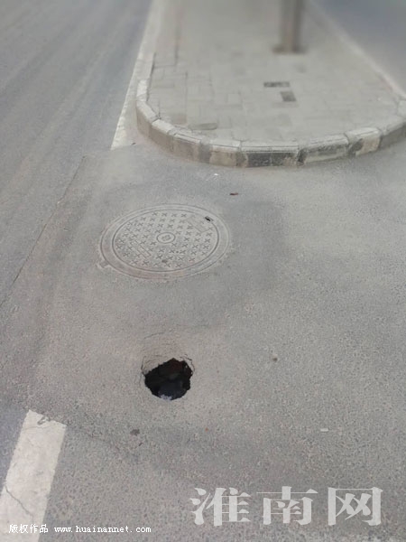 淮河早報(bào)、淮南網(wǎng)記者來(lái)到朝陽(yáng)東路,在靠近領(lǐng)城小區(qū)的張大橋公交站旁,看到了坑洞。只見(jiàn)洞口比碗口大,約有幾十厘米深,周邊呈凹陷狀,旁邊還有一個(gè)標(biāo)著“污”字的窨井蓋。由于擔(dān)心坑洞擴(kuò)大,行人紛紛繞行。