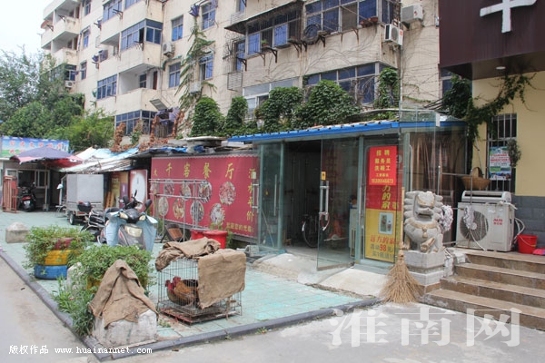 接報后,淮河早報、淮南網(wǎng)記者來到奧林花園小區(qū),在居民的指引下找到了被投訴的飯店。該飯店位于小區(qū)內(nèi),離西大門不遠(yuǎn),飯店至西門門衛(wèi)室之間的圍墻邊,搭建了一排藍(lán)色彩鋼瓦棚,堆放著不少破舊雜物;靠近飯店的彩鋼瓦棚被搭成一間簡易屋子,里面放著冰柜等物品;飯店門前的人行道上放置著一個雞籠,里面養(yǎng)著幾只公雞。據(jù)居民們介紹,這家飯店在小區(qū)內(nèi)開了一段時間,經(jīng)常在門前養(yǎng)雞,破壞小區(qū)環(huán)境。后來為了方便存放東西,又搭建了簡易彩鋼瓦棚。為此居民多次反映,可小區(qū)物業(yè)不知為何一直不作為。無奈之下,他們只好向淮河早報、淮南網(wǎng)進(jìn)行求助。