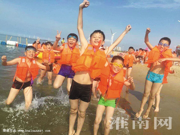 威海是個(gè)靠海的城市,對(duì)于愛水的孩子們來說,游泳玩水當(dāng)然是必不可少的一部分。在夏令營中,小記者們有三天時(shí)間都是和大海親密接觸。在海上公園坐飛艇,在海里游泳;在小石島提籠抓蟹,品嘗自己打撈上來的扇貝、青口等海鮮;在旅游度假區(qū)坐快艇去看海上博物館;在海邊舉行了盛開的篝火晚會(huì),大家一起手拉手做游戲、唱歌,一起為生日的小朋友慶生……海邊,留下了孩子們一排排的小腳。缓_,留下了孩子們一串串銀鈴般的笑聲;海邊,留下了孩子們一陣陣悠揚(yáng)的歌聲……
