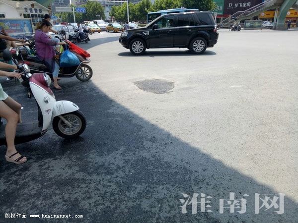 接報(bào)后,淮河早報(bào)、淮南網(wǎng)記者于當(dāng)日下午來(lái)到國(guó)慶路與龍湖路交叉口處,找了一圈也沒(méi)看到市民所稱(chēng)的“大洞”,只在北側(cè)路口中間看到了一處黑色的柏油“補(bǔ)丁”。一位騎電動(dòng)車(chē)的市民介紹,上午她從這里路過(guò)時(shí)確實(shí)看到一個(gè)大洞,就是那塊“補(bǔ)丁”的位置!靶姨澪耶(dāng)時(shí)注意了一下前方的路面,發(fā)現(xiàn)有個(gè)黑色洞口后,就趕緊避開(kāi)了,后來(lái)走近一看,發(fā)現(xiàn)大洞還挺深,就向旁邊執(zhí)勤的交警進(jìn)行了反映,沒(méi)想到下午就修好了。”