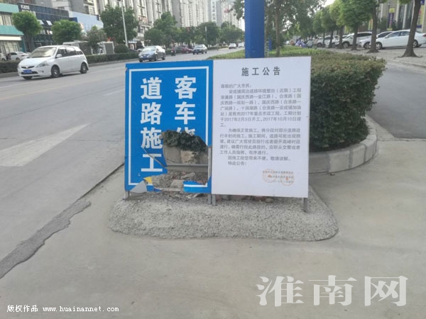 接電后,淮河早報、淮南網(wǎng)記者來到市民反映的地點,在不遠處記者看到有兩塊牌子矗立在路口邊綠化帶前,十分明顯。走近看,這兩塊牌子一塊是施工公告牌,一塊是提醒繞行的牌子,兩塊牌子底部被用水泥混凝土固定在路面上。根據(jù)施工公告,淮河早報、淮南網(wǎng)記者看到,施工內(nèi)容是“安成鋪周邊道路環(huán)境整治(近期)工程”,工程計劃為“2017年2月3日開工,2017年10月10日竣工”,公告落款單位為“淮南市公安局交通警察支隊”和“淮南市城鄉(xiāng)建設(shè)委會”,落款日期為“二〇一七年二月四日”。根據(jù)該公告內(nèi)容,工程早已結(jié)束,為何公告牌還在路口?