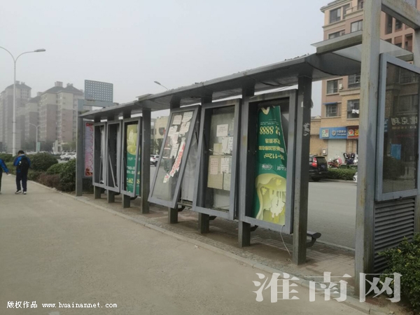 在泉山湖洞山中學公交站,站臺候車亭廣告箱體破損嚴重,有的不能正常關閉,有的箱體玻璃缺失,還有亂貼小廣告現(xiàn)象,整個候車亭廣告箱體顯得凌亂不堪。(記者)