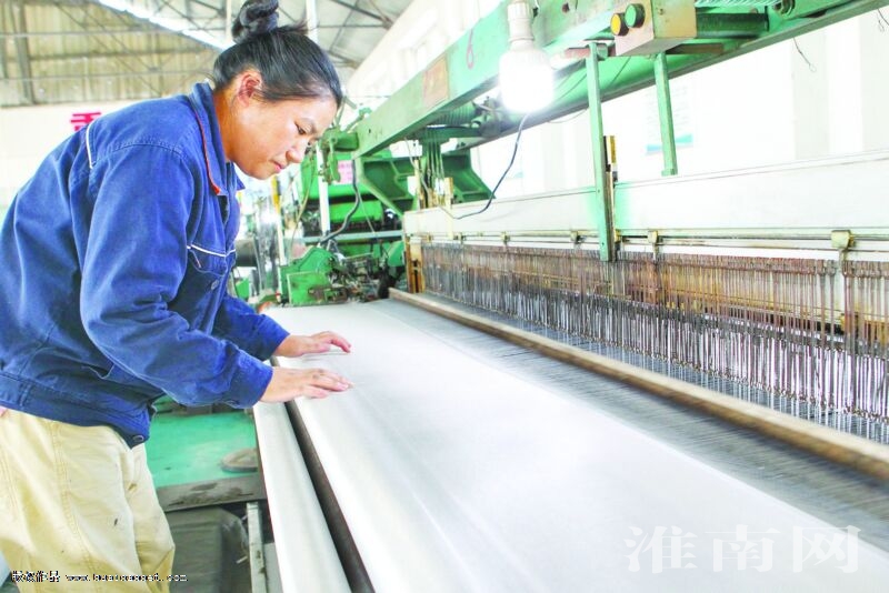 圖為安徽東浙盛科技公司工人在2800MM大寬幅滌綸長(zhǎng)絲風(fēng)筒基布織布機(jī)前察看成品質(zhì)量。 (記者 陳海濤 攝)
